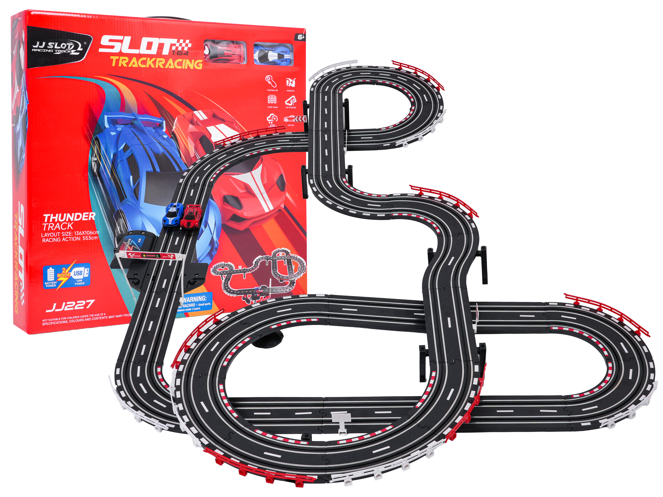 Celková délka trati dosahuje 553 cm a díky tříúrovňovému provedení se dráha vine do výšky s ostrými zatáčkami, spirálami i rychlými rovinkami.