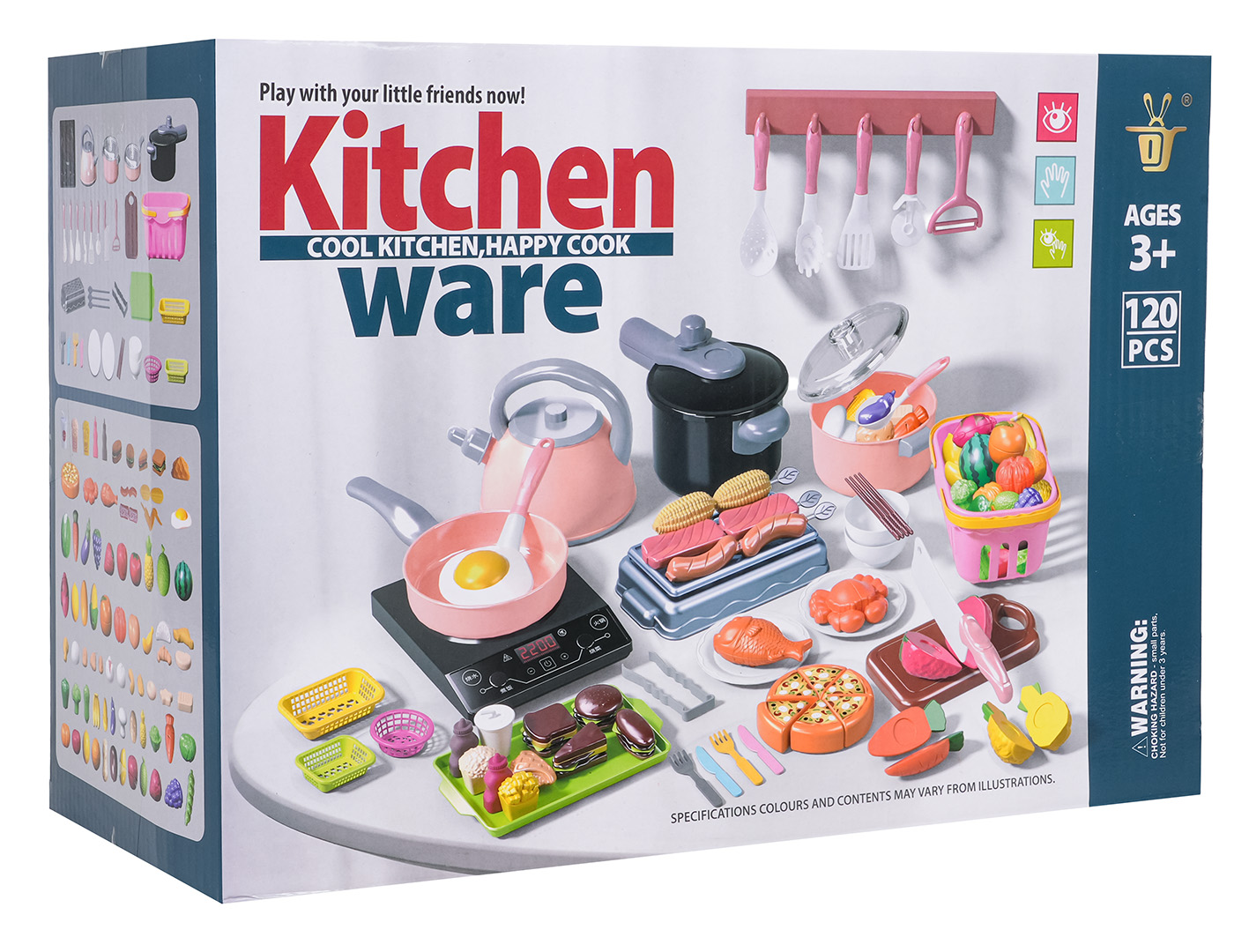 Dětská kuchyňská sada s nádobím a doplňky je ideální hračkou pro malé kuchaře a kuchařky. V balení najdete až 120 prvků – hrnce, pánev, tlakový hrnec, čajník, náčiní, nádobí, nákupní košík a množství potravinových atrap.