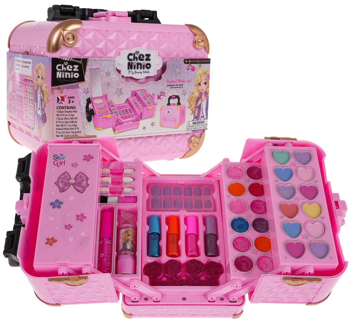 Dětský make-up set Ninio s kufříkem je skvělým dárkem pro malé milovnice mody a krásy. Stylový růžový kufřík se zavíráním na západku a praktickým držátkem ukrývá kompletní sadu barevných kosmetických doplňků – od stínů na oči po lesky na rty.
