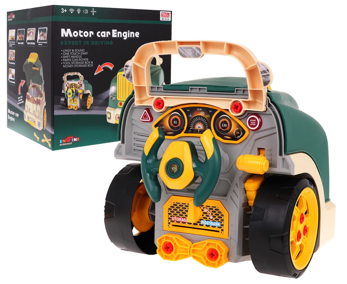 Na palubní desce je startovací tlačítko s realistickým zvukem startování motoru, volant s klaksonem a výstražný signál. Nechybí svítící reflektory a osvětlení motoru. Všechny šroubky a nářadí lze uklidit do praktického schovku pod volantem. Díky rukojeti se hračka snadno přenáší.
