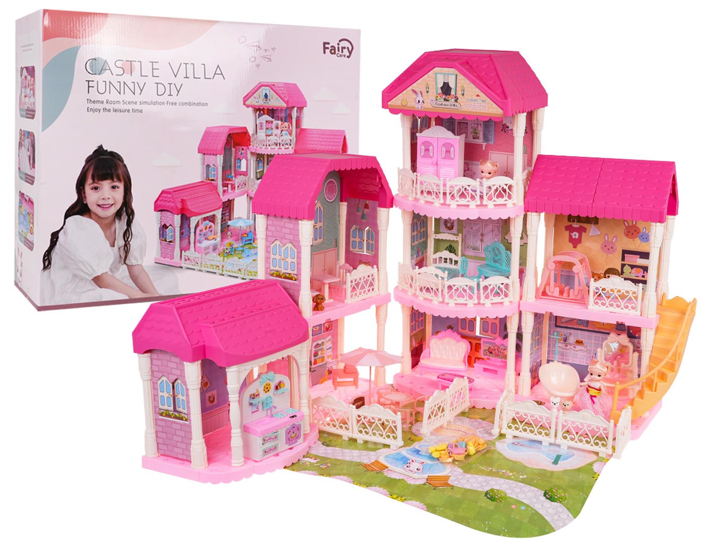 Uvnitř děti najdou kompletně vybavené místnosti – obývací pokoj, koupelnu, ložnici, kuchyň, šatnu i dětský pokoj. Nechybí venkovní zóna s houpačkou a slunečníkem. Domek doplňují figurky, zvířátka a spousta detailních doplňků pro nekonečné herní scénky.