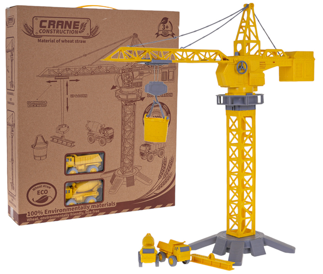 EKO stavební jeřáb vyrobený z ekologických materiálů je skvělou hračkou pro děti od 3 let. V balení kromě jeřábu najdete také dvě stavební autíčka – míchačku a sklápěčku – a příslušenství pro zvedání nákladů.