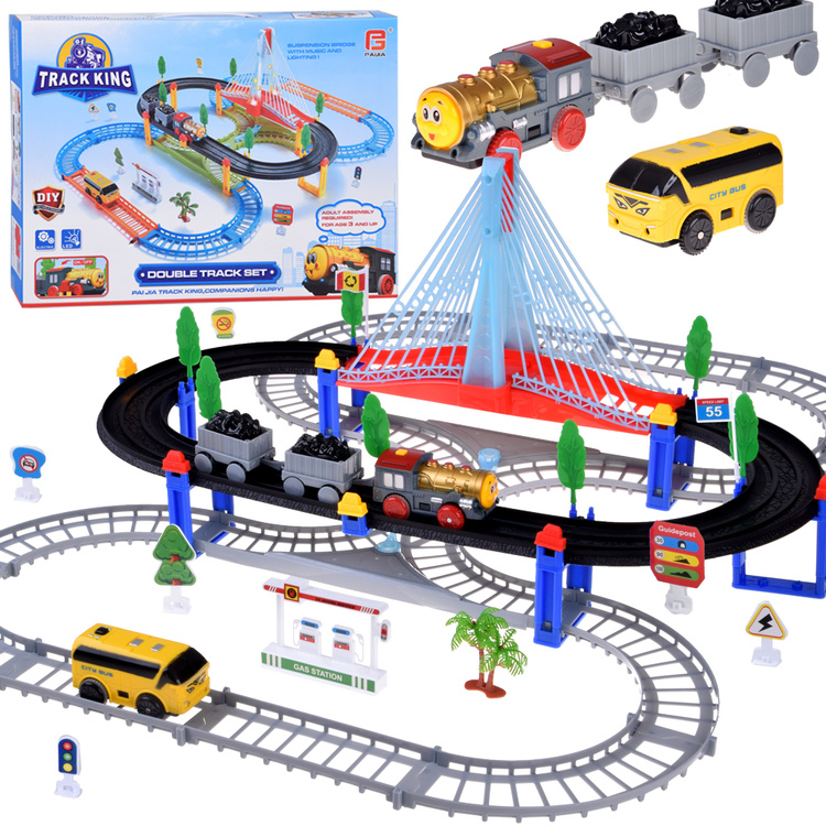 Elektrická vláčkodráha s lokomotivou a dvěma vagóny. Koleje o délce až 626 cm s mosty, zatáčkami a stoupáním pro dlouhé hodiny zábavy.