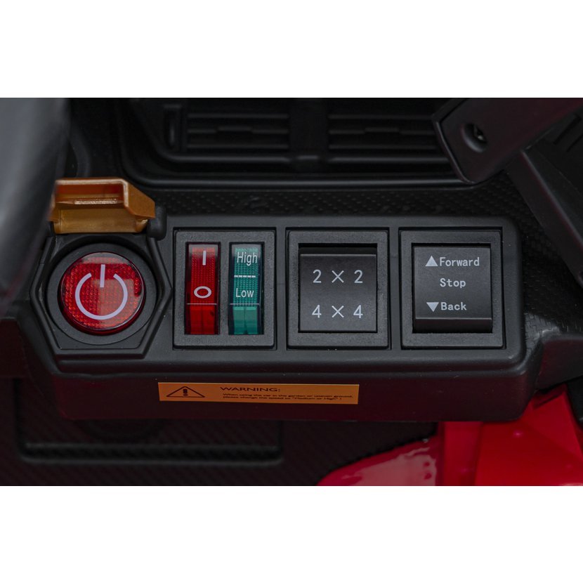 Bezpečnost je zajištěna pomocí bezpečnostních pásů, funkce plynulého rozjezdu a zastavení, a hlavně dálkového ovladače (2,4 GHz) s tlačítkem STOP, které umožňuje rodičům kdykoli vozítko zastavit.