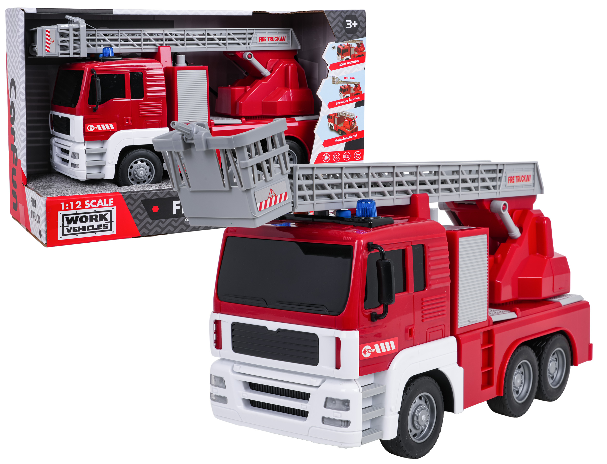 Interaktivní hasičské auto v měřítku 1:16 pro děti od 3 let. Se světelnými a zvukovými efekty, funkční stříkačkou na vodu a pohyblivou drabinou.