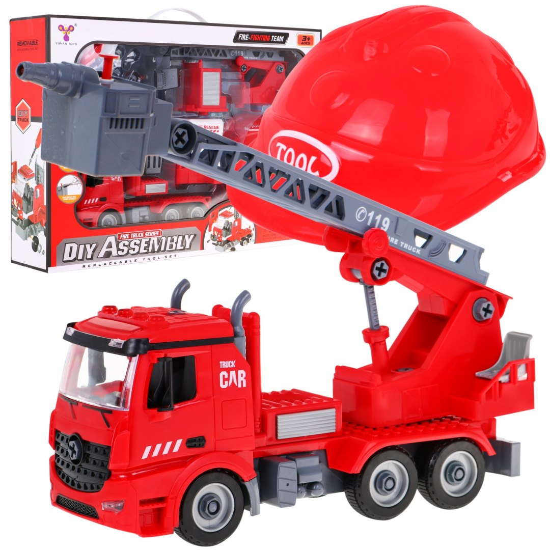 Sada vhodná pro chlapce, kteří sní o tom, že se stanou hasiči. V sadě se nachází hasičské auto 2v1 a helma. Hračka je určena pro děti od 3 let. Hasičský vůz musí být sestaven z konstrukčních dílů, součástí jsou šrouby a nástroje. Vůz má odnímatelný výsuvný a o 180 stupňů otočný zvedák s košem nebo výsuvný a otočný žebřík s vodním dělem, které skutečně funguje. Hasičský vůz je napájen 3 x bateriemi LR44, které jsou součástí sady, má také světelné a zvukové funkce. Vydává zvuky sirény, klaksonu nebo nastartování motoru a zvuky jsou doprovázeny blikajícími světly. Sada obsahuje helmu, díky níž se Vaše dítě bude cítit jako skutečný hasič.