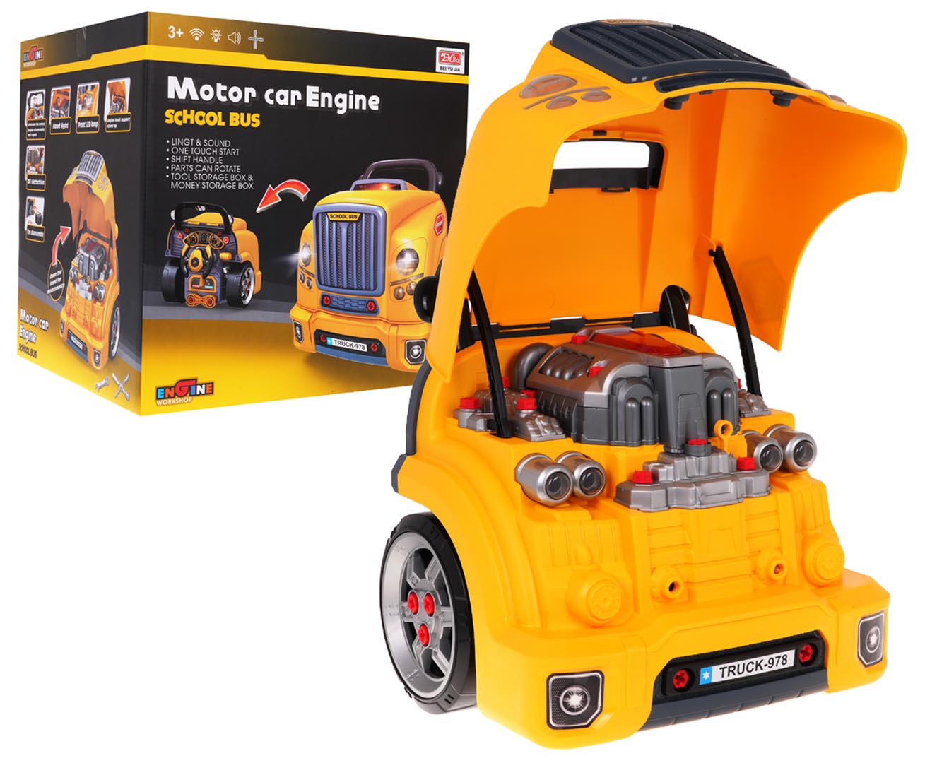 Tento interaktivní školní autobus je ideální hračkou pro malé kutily od 3 let. Děti mohou otevřít kapotu, nahlédnout pod ni a pomocí přiloženého nářadí opravovat motor, měnit kola nebo dotahovat šrouby.