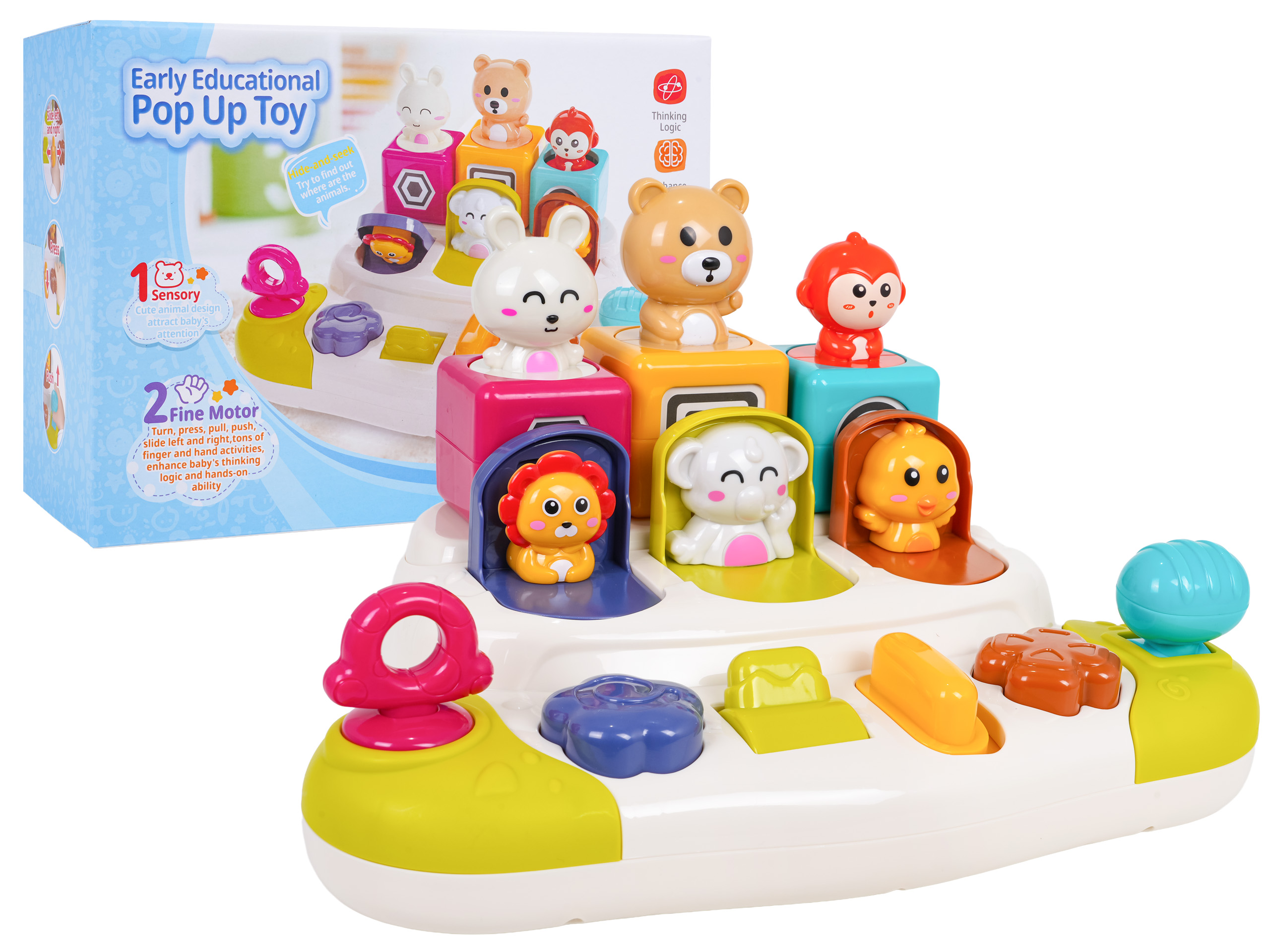 Dítě může otáčet, mačkat, posouvat a přepínat různé ovládací prvky, které otevírají okénka s ukrytými zvířátky – králíčkem, medvídkem, opičkou, lvem, slonem a kachničkou. Každé otevření přináší překvapení a radost, když zvířátko „vyskočí“.