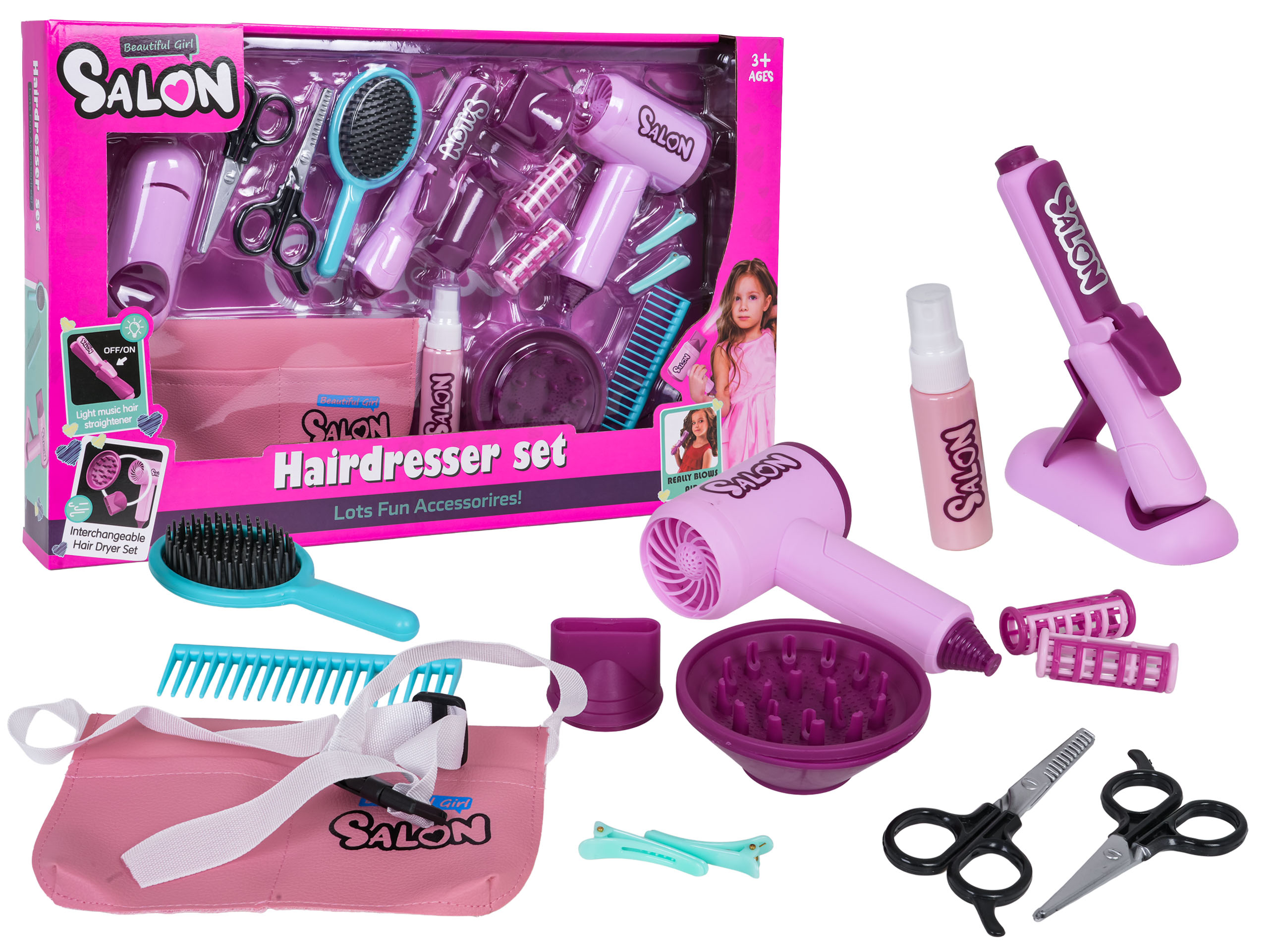 Fén vydává realistický zvuk foukání a má slabý proud vzduchu, zatímco žehlička svítí. Hračka je vyrobena z kvalitního plastu a díky svému designu připomíná skutečné kadeřnické nástroje. Děti si tak mohou vyzkoušet roli malé kadeřnice, trénovat česání, stříhání i zdobení účesů.