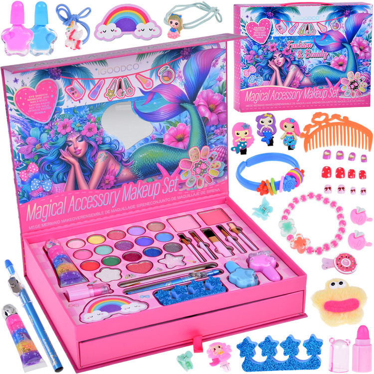 Po otevření čeká na malou princeznu 15 stínů na oči, růže, štětce, laky, rtěnka a dokonce i nalepovací nehty. V šuplíčku pod hlavní částí se navíc ukrývá spousta vlasových doplňků – sponečky, gumičky, hřebínek, ale i krásné dětské šperky s motivy mořské panny.