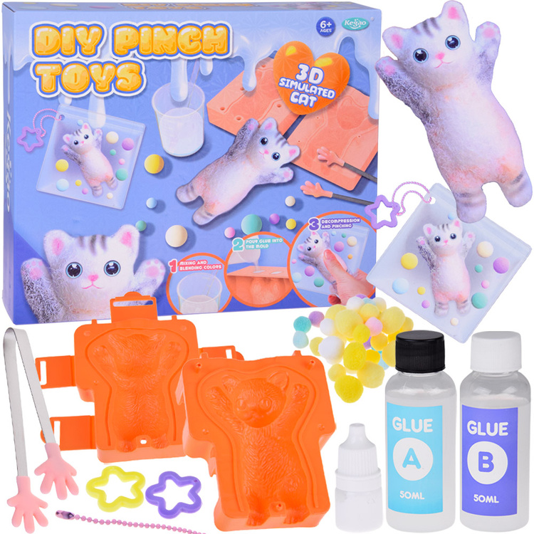 Stačí smíchat přiložené složky, nalít hmotu do formy, nechat ztuhnout, ozdobit a připevnit do průhledného sáčku. Výsledkem je roztomilý antistresový přívěsek ve tvaru kočičky, který můžeš mít stále s sebou.