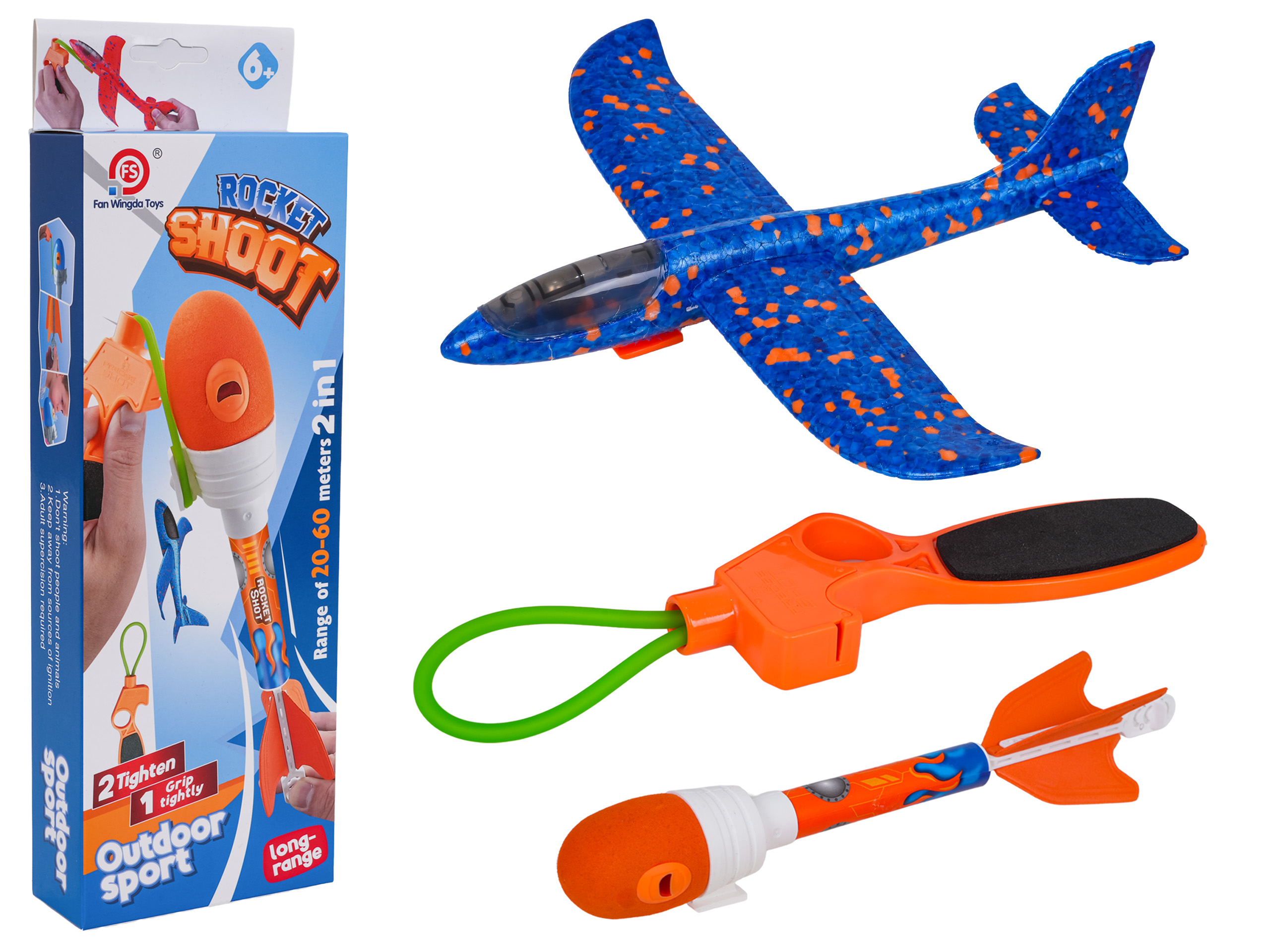 Zábavný létající set 2v1 přináší dětem skvělou akční zábavu na zahradu, hřiště i park. Součástí je lehký modrý letadlový kluzák ze speciálního pěnového materiálu, odolná raketa se světelným efektem a prak s gumou pro snadné vystřelení.