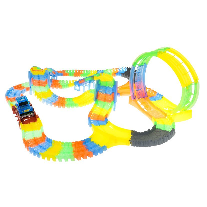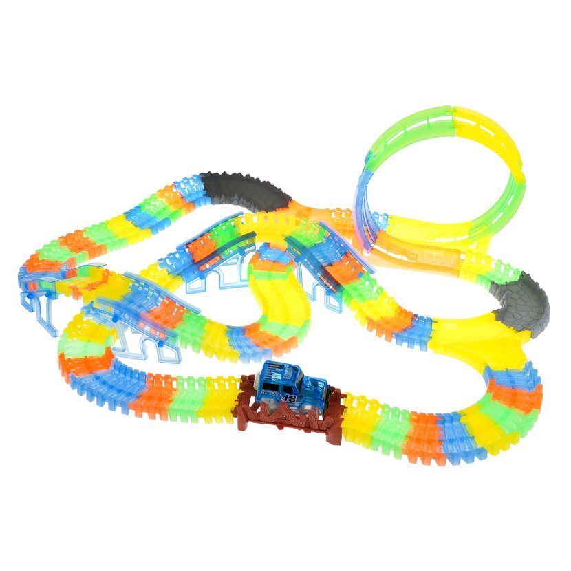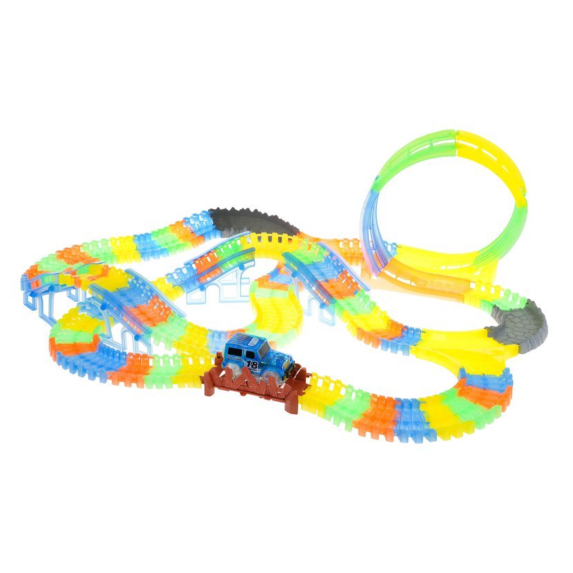 Velká autodráha s 3 smyčkami 360° a autíčkem s LED světlem. Díly jsou fluorescenční – ve tmě svítí, což dělá ze závodů nezapomenutelnou podívanou.