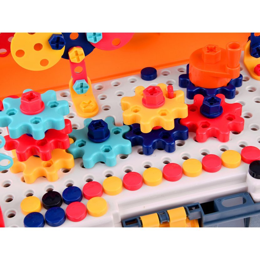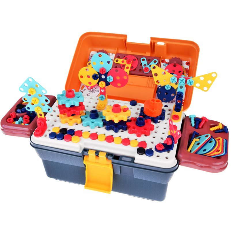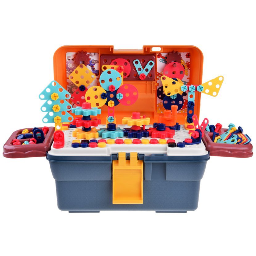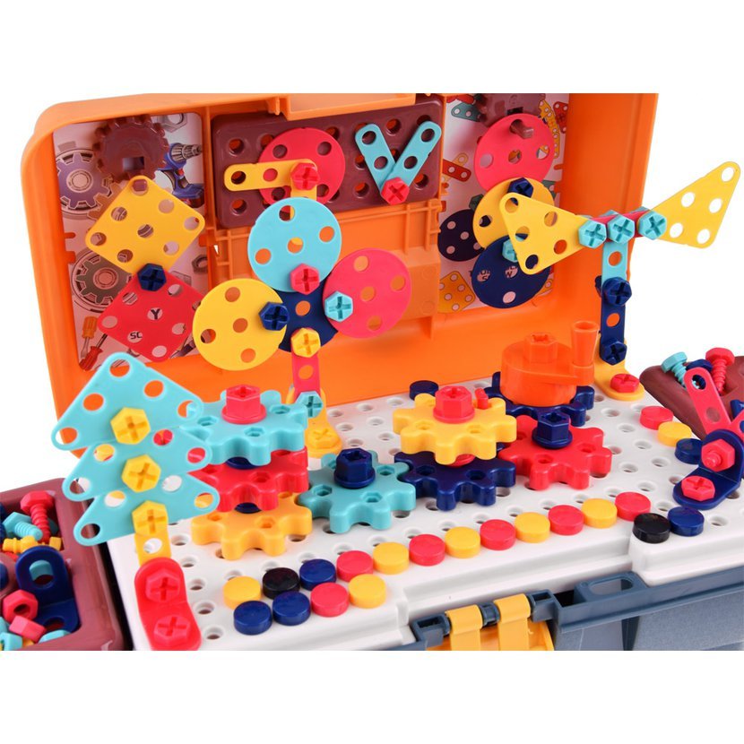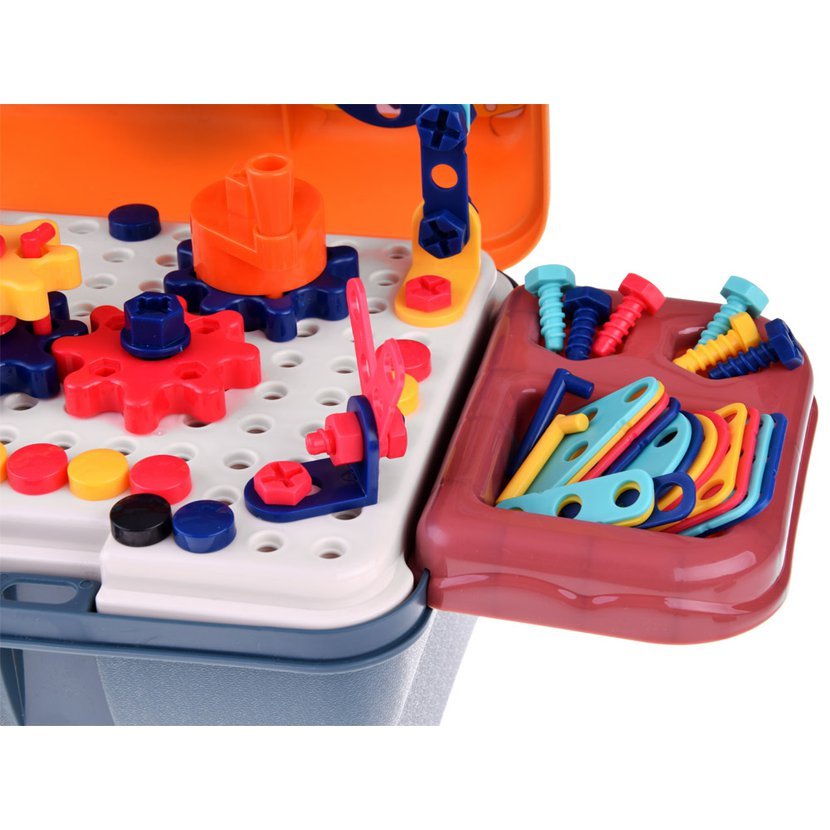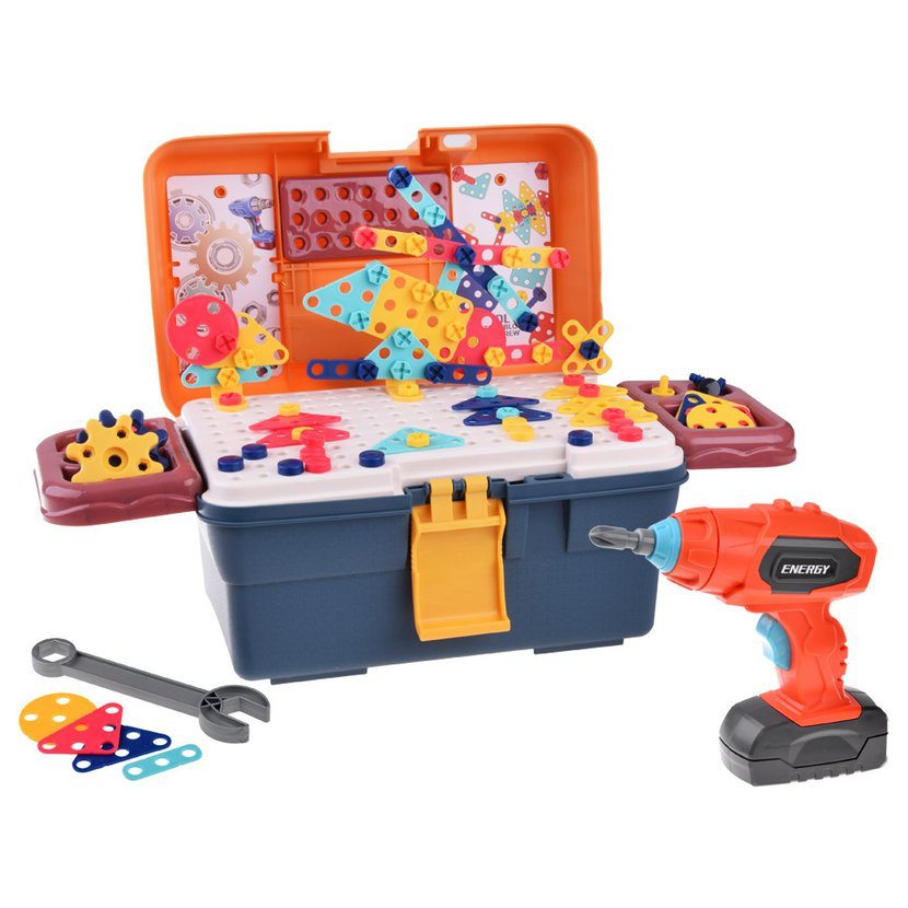 Bohatě vybavený pracovní box s nářadím, šrouby, vruty a torzním příslušenstvím ocení každý mladý kutil. Šroubování, opravování a vytváření nových 3D konstrukcí poskytne mladému kutilovi spoustu kreativní zábavy. Box má pracovní plochu, poličky na příslušenství, zkrátka vše, co je v dílně potřeba. Barevná ozubená kola a šrouby se jednoduše přišroubují na desku s otvory a vznikne pohyblivá stavba. Hračka umožňuje stavět různé konstrukce a návrhy, např. auto, vrtulník, zvíře atd. Součástí sady je brožura s nápady. Hra u dítěte rozvíjí tvůrčí myšlení, rozpoznávání barev, kombinování barev a manuální dovednosti.