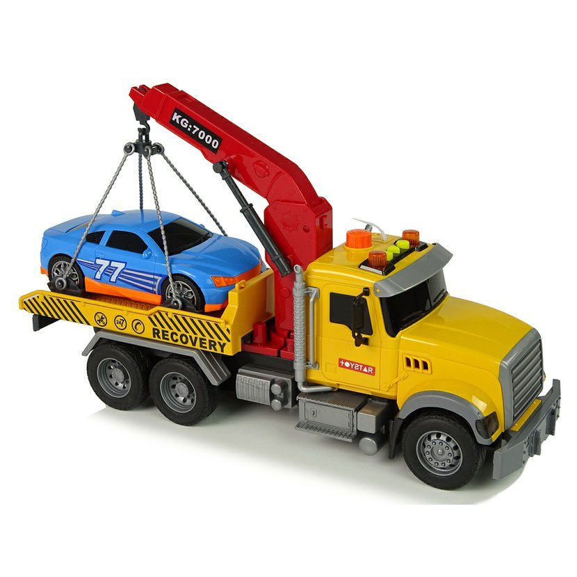 Odtahový vůz s autem Recovery je ideální hračkou pro malé milovníky motorových vozidel. S touto hračkou mohou děti zachraňovat porouchaná vozidla a představovat si, že jsou mechanici. Vůz má na horní části kabiny oranžové tlačítko, které při stisknutí aktivuje jeřáb a umožní zvednout přiložené modré auto s oranžovými prvky. Auto se připevňuje pomocí speciálních úchytů a lze ho snadno spustit nebo na rampu vytáhnout. Hračka zahrnuje také zvukové a světelné efekty pro realističtější zážitek, včetně výstražných majáků a zvuků jako klakson či couvání. Šedý a žlutý odtahový vůz je navržen tak, aby byl dobře viditelný, a je vybaven třecím pohonem na zadní nápravě pro snadné hraní.