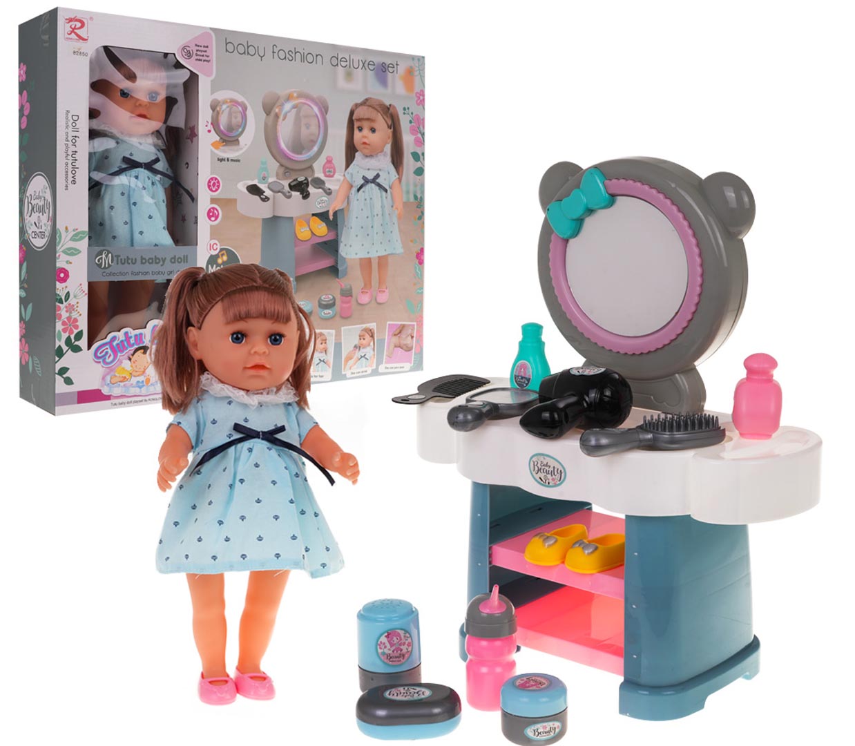 Součástí sady je toaletní stolek s podsvíceným zrcadlem a zvukovými efekty. Děti mají k dispozici spoustu doplňků pro péči o panenku i pro česání a zdobení jejích vlásků. Celá sada je vyrobena z kvalitního plastu v živých barvách a podporuje rozvoj fantazie i jemné motoriky.