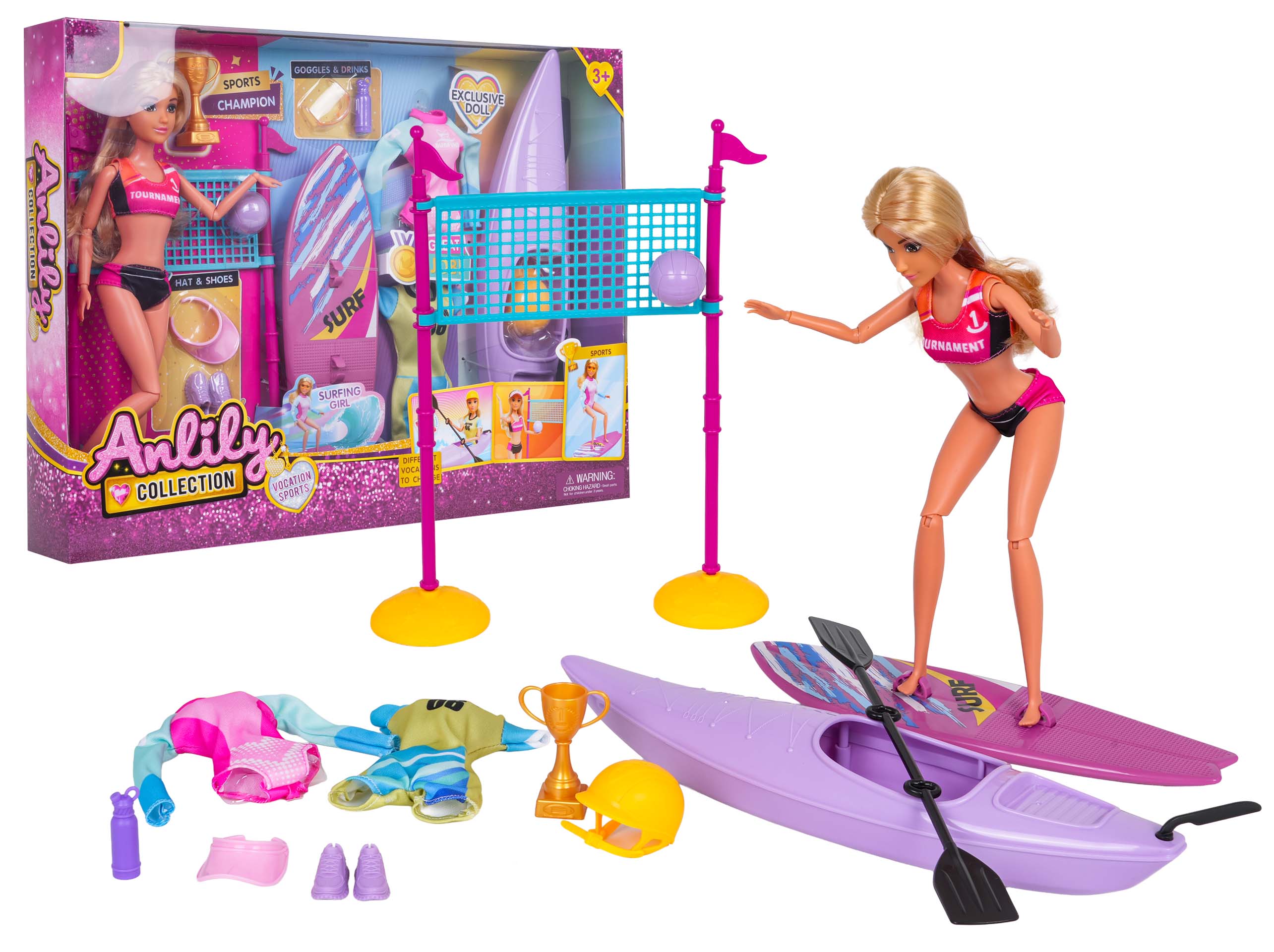 Součástí sady je surfovací prkno, kajak s pádly, síť na volejbal, sportovní doplňky a dokonce i vítězný pohár. Panenka má pohyblivé ruce, nohy, lokty, kolena, dlaně i hlavu, takže se snadno přizpůsobí různým scénářům hry.