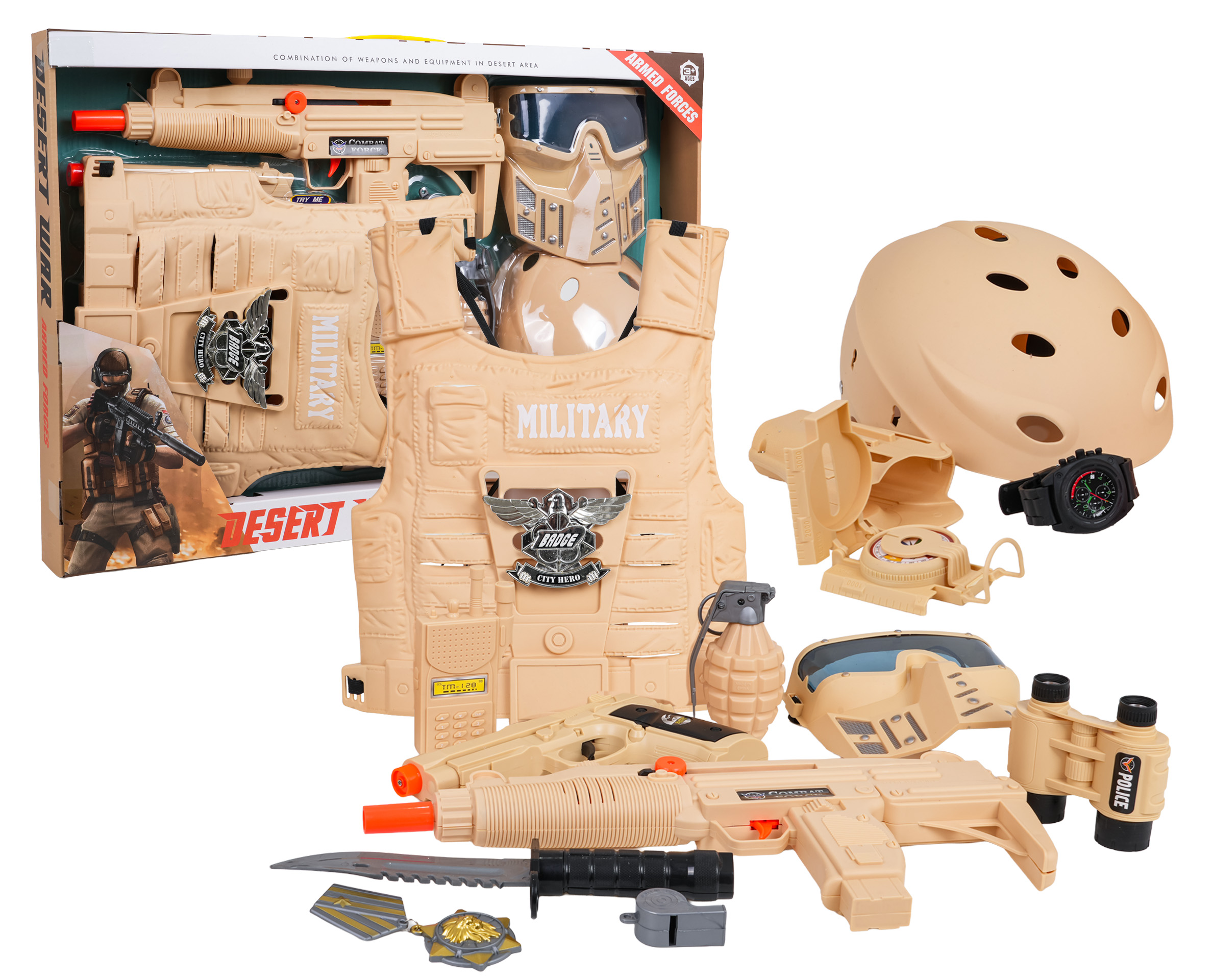 Dětská sada vojáka je kompletní vybavení pro malé dobrodruhy, kteří milují akci, hraní rolí a vojenské mise. Všechny prvky jsou vyrobeny z kvalitního, odolného a bezpečného plastu v realistickém pískovém odstínu.