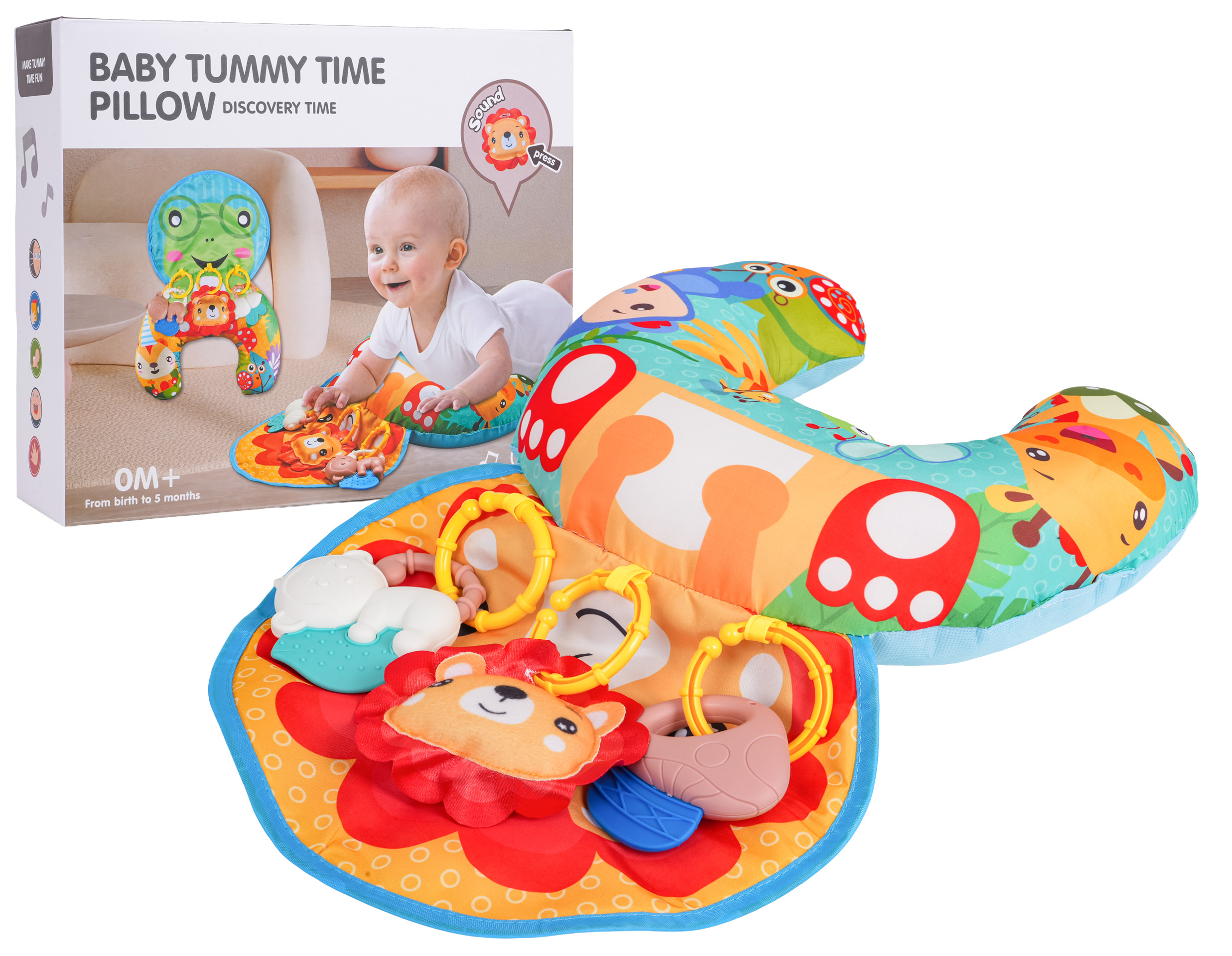 Měkoučký a barevný polštář – rohlík se závěsnými hračkami ve tvaru roztomilého lvíčka. Vhodný od prvních dnů života, ideální jako podpora při ležení na bříšku, sezení i do autosedačky. Obsahuje odnímatelné závěsky s chrastítkem, kousátkem a pískátkem.