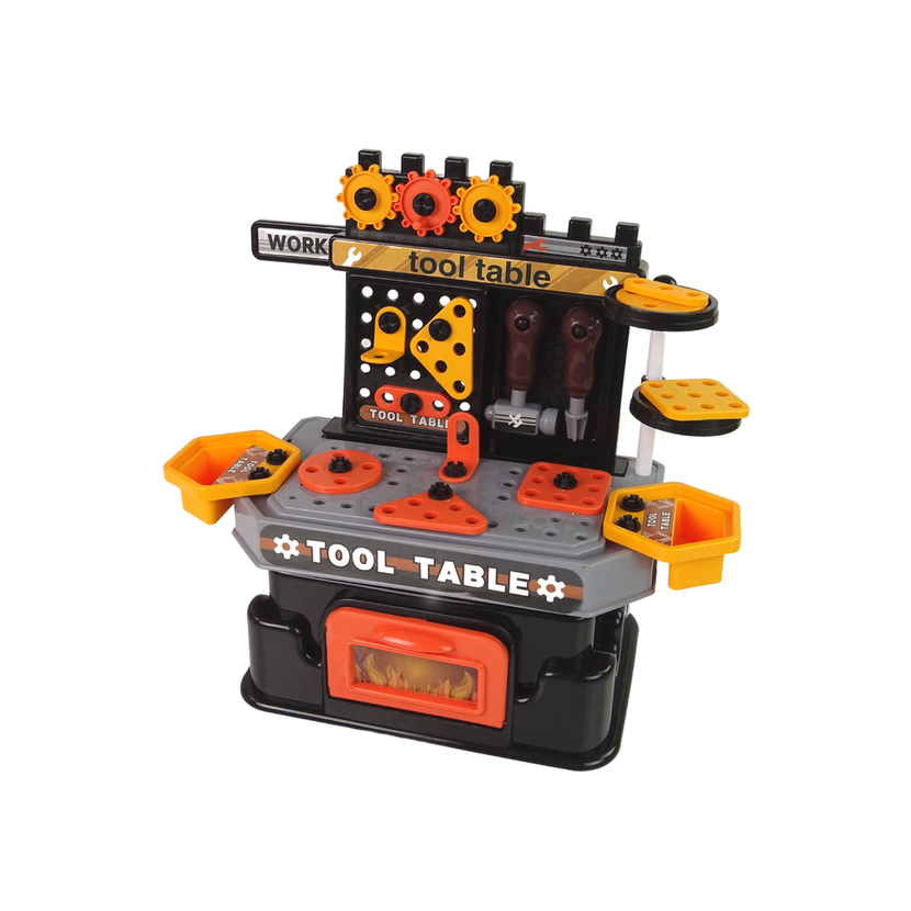 Kompletní pracovní dílna pro malého kutila se 57 díly! Stolek s nářadím, úložným prostorem, nástavcem na nářadí a mnoha doplňky pomůže dítěti rozvíjet zručnost a kreativitu. Perfektní volba pro kluky, kteří rádi napodobují tatínka.