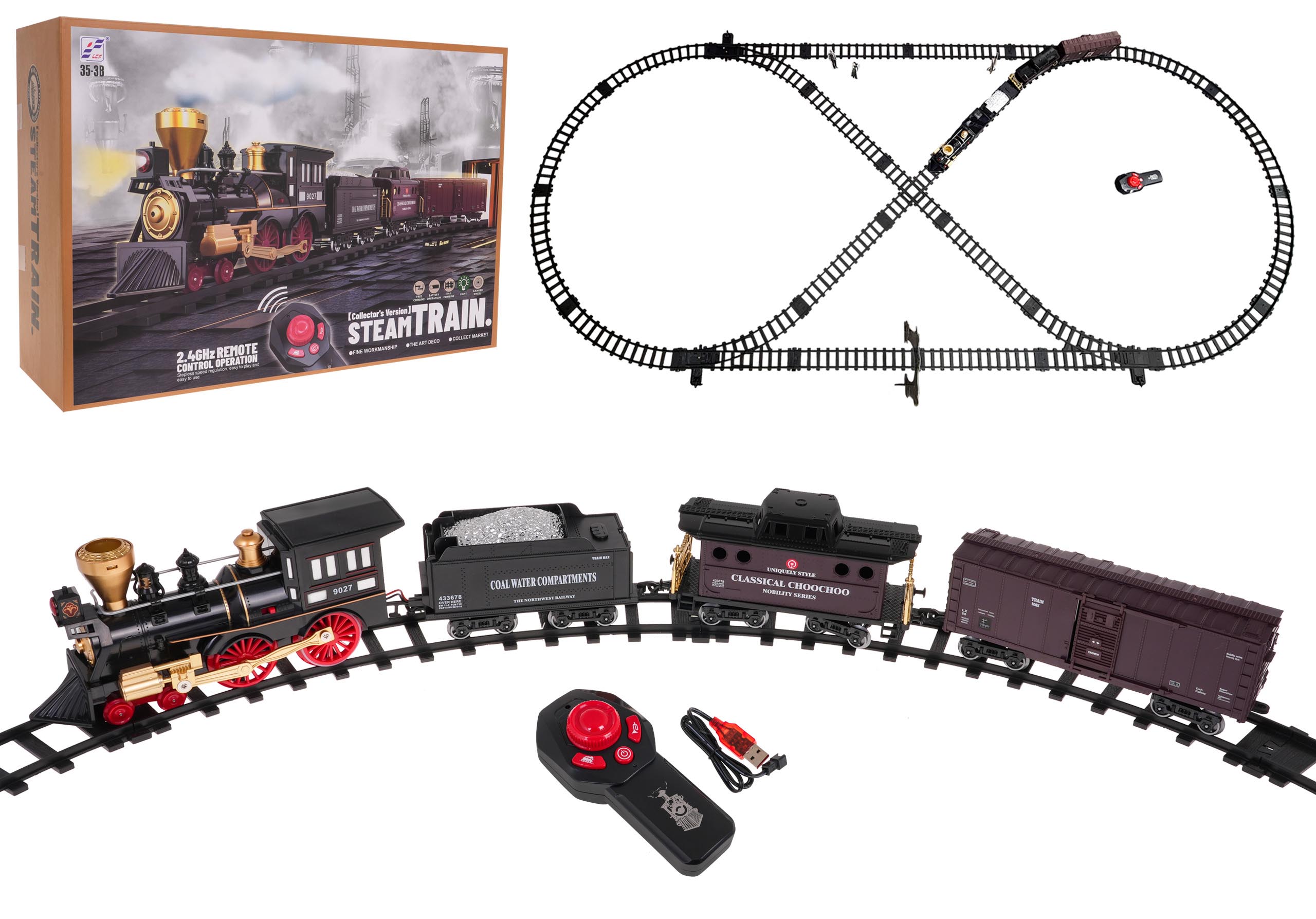 Retro vláček na dálkové ovládání přináší jedinečnou atmosféru železnice přímo do dětského pokoje. Lokomotiva je vybavena funkcí dýmu – po naplnění vodou pomocí přiložené pipetky z komína vychází pára, která v kombinaci se světelnými efekty v předním reflektoru působí velmi realisticky.