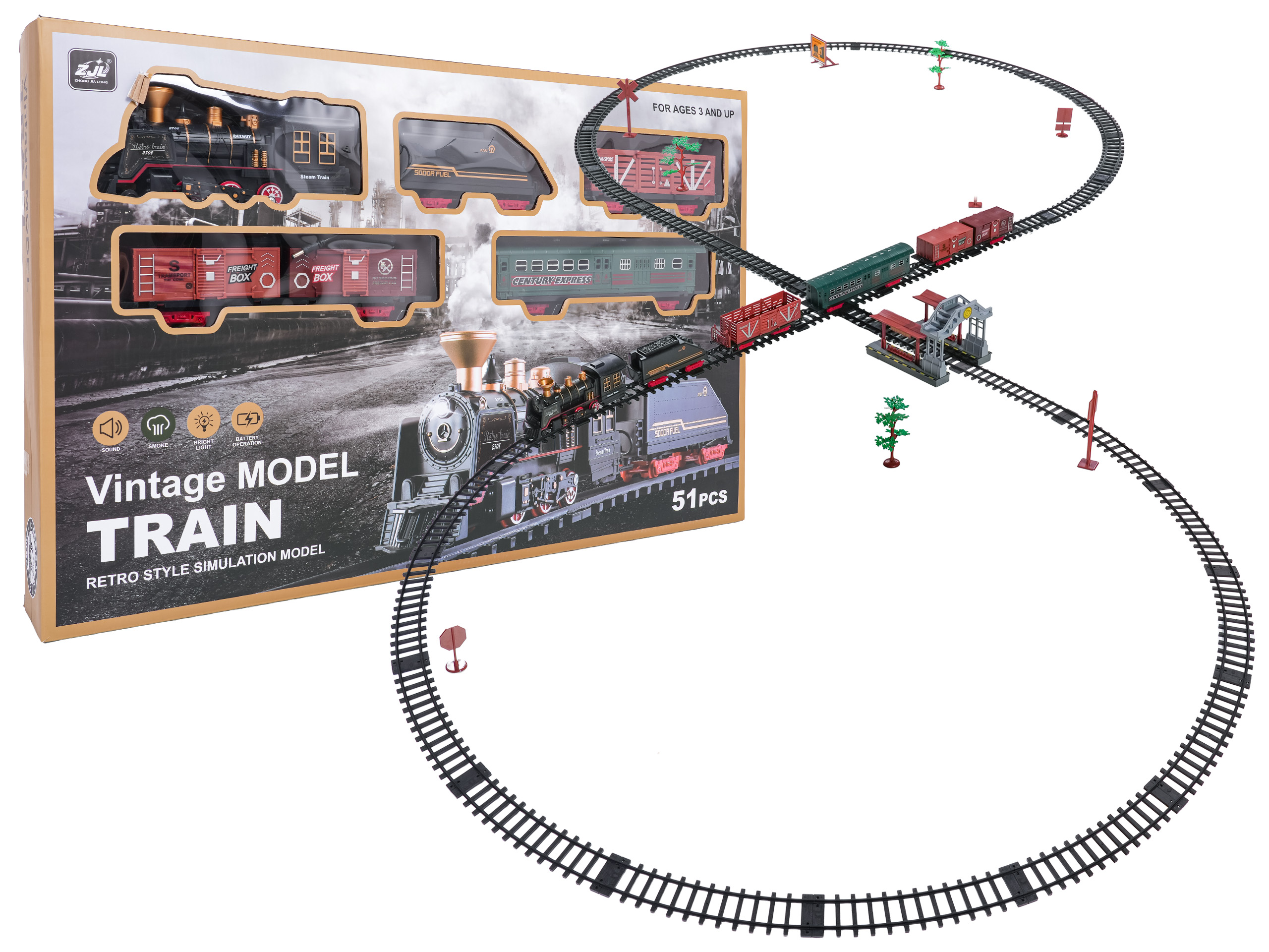 Elektrická retro vláčkodráha s realistickými efekty kouře, světla a zvuku. Lokomotiva s akumulátorem 3,7 V 1200 mAh potěší všechny malé milovníky železnic od 3 let.