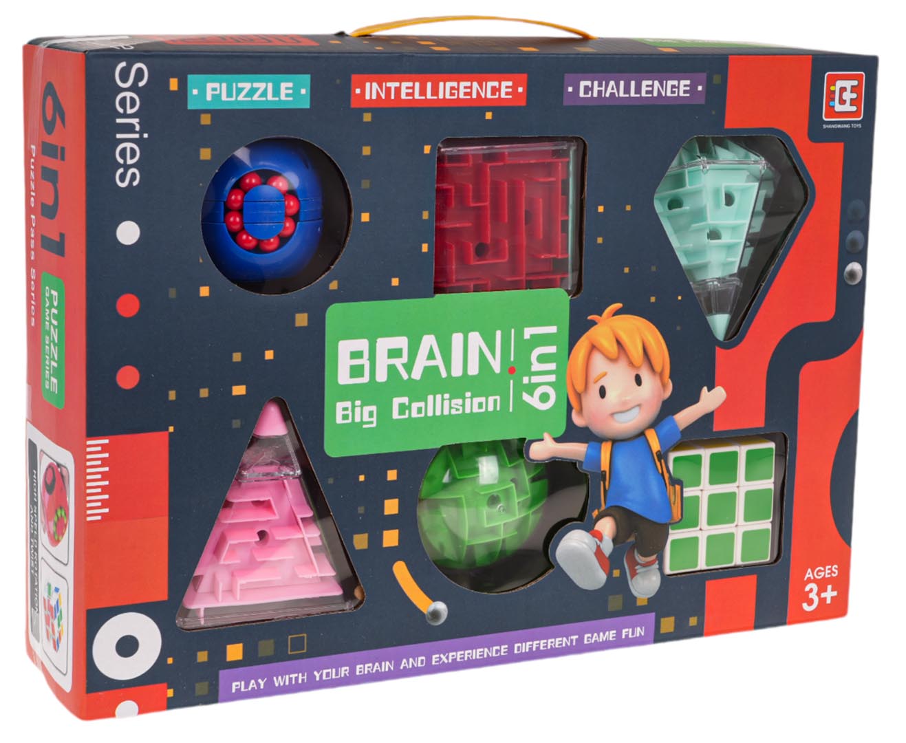 Součástí jsou různé typy hlavolamů: kostka s labyrintem a kuličkou, ohebný spinner s úkoly a šňůrkou, dvě pyramidky s labyrintem, klasická kostka Rubik a kulatá skládačka.