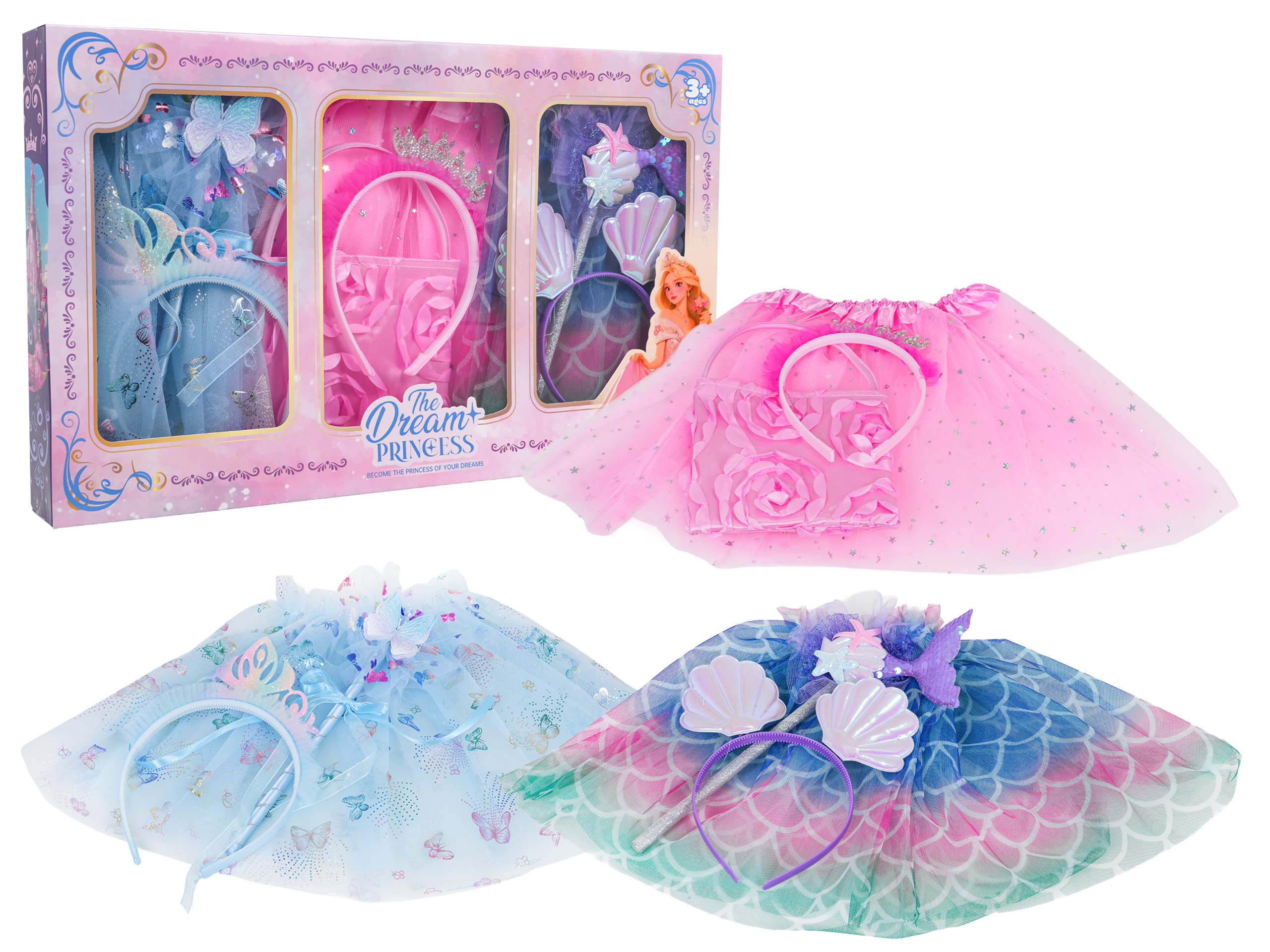 Součástí balení jsou tři tylové sukýnky na gumu, tři čelenky do vlasů, stylová kabelka a dvě kouzelné hůlky – s motivem motýlka a mořské víly. Děti se tak mohou proměnit v princeznu, vílu nebo baletku a rozvíjet při tom svou fantazii.