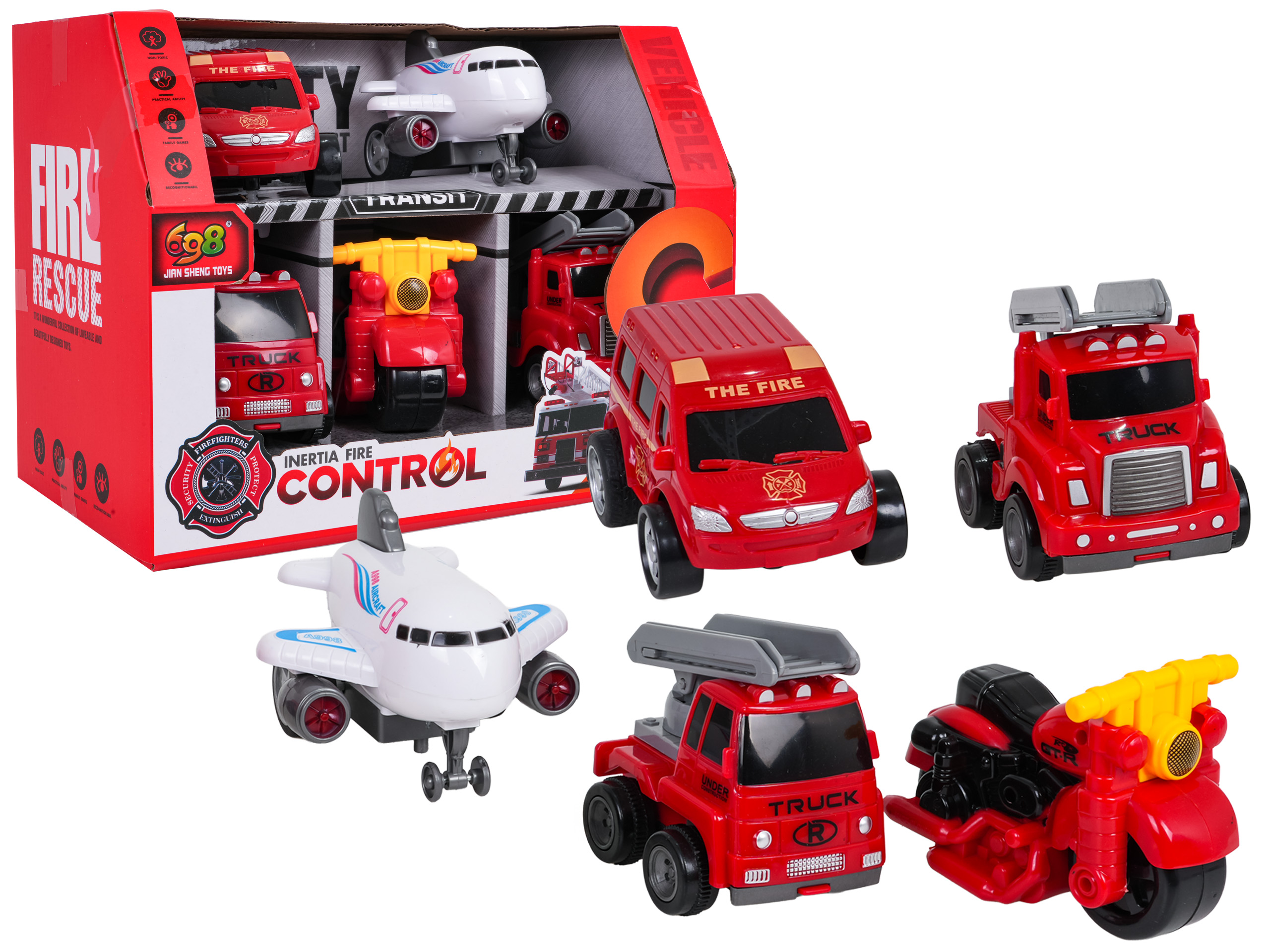 Sada pěti hasičských vozidel v měřítku 1:36 pro děti od 3 let. Obsahuje auta, motorku a letadlo s pohonem na zpětné natažení. Balení slouží i jako garáž či parkoviště. Skvělý dárek pro malé milovníky záchranářských akcí.