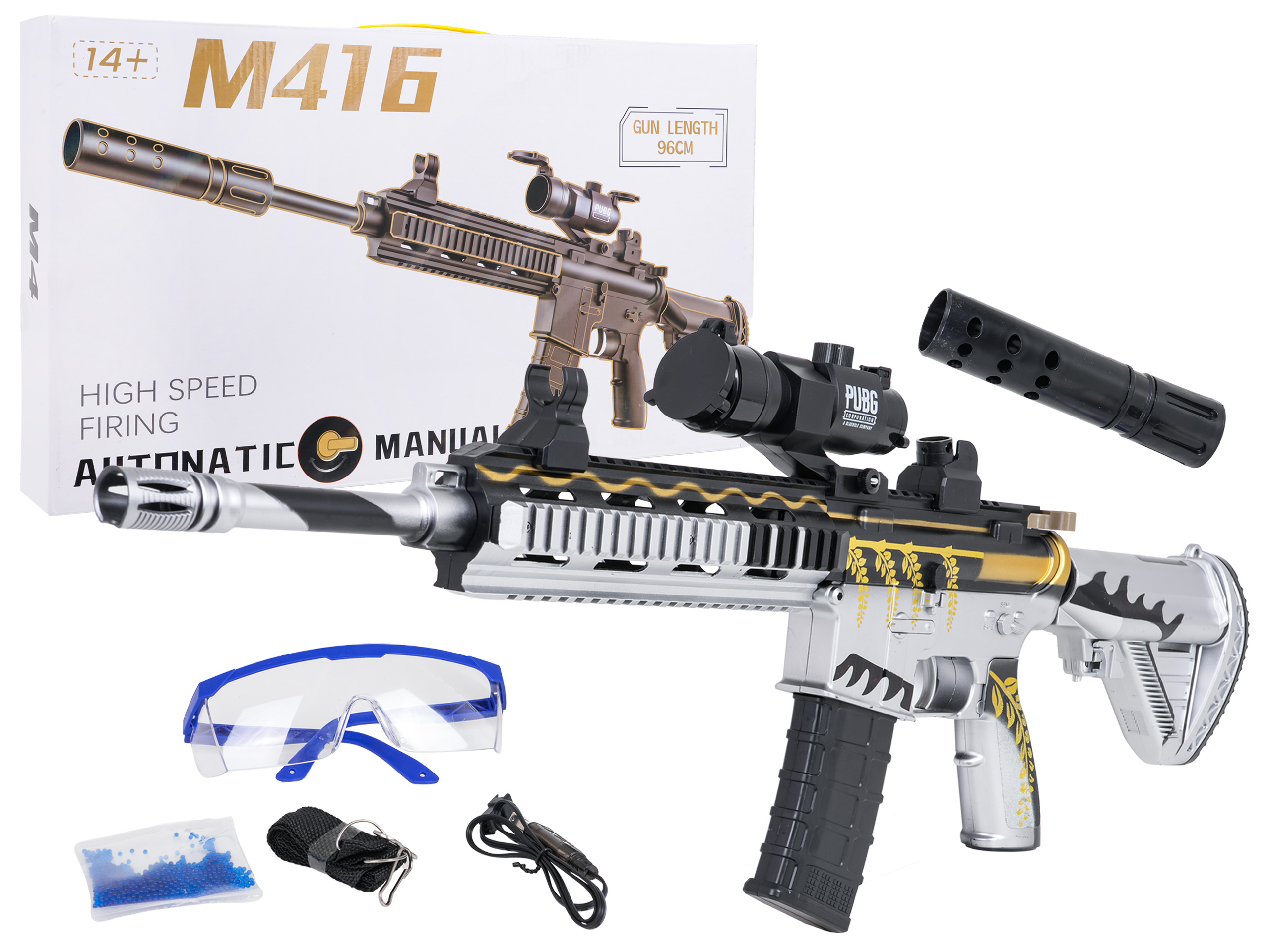 Šedá karabina M416 na vodní kuličky je robustní herní model inspirovaný vojenskou útočnou puškou. Je určena pro hráče od 14 let a používá hydrogelové (gelové) kuličky o průměru 7–8 mm, které po dopadu prasknou a rozplynou se.