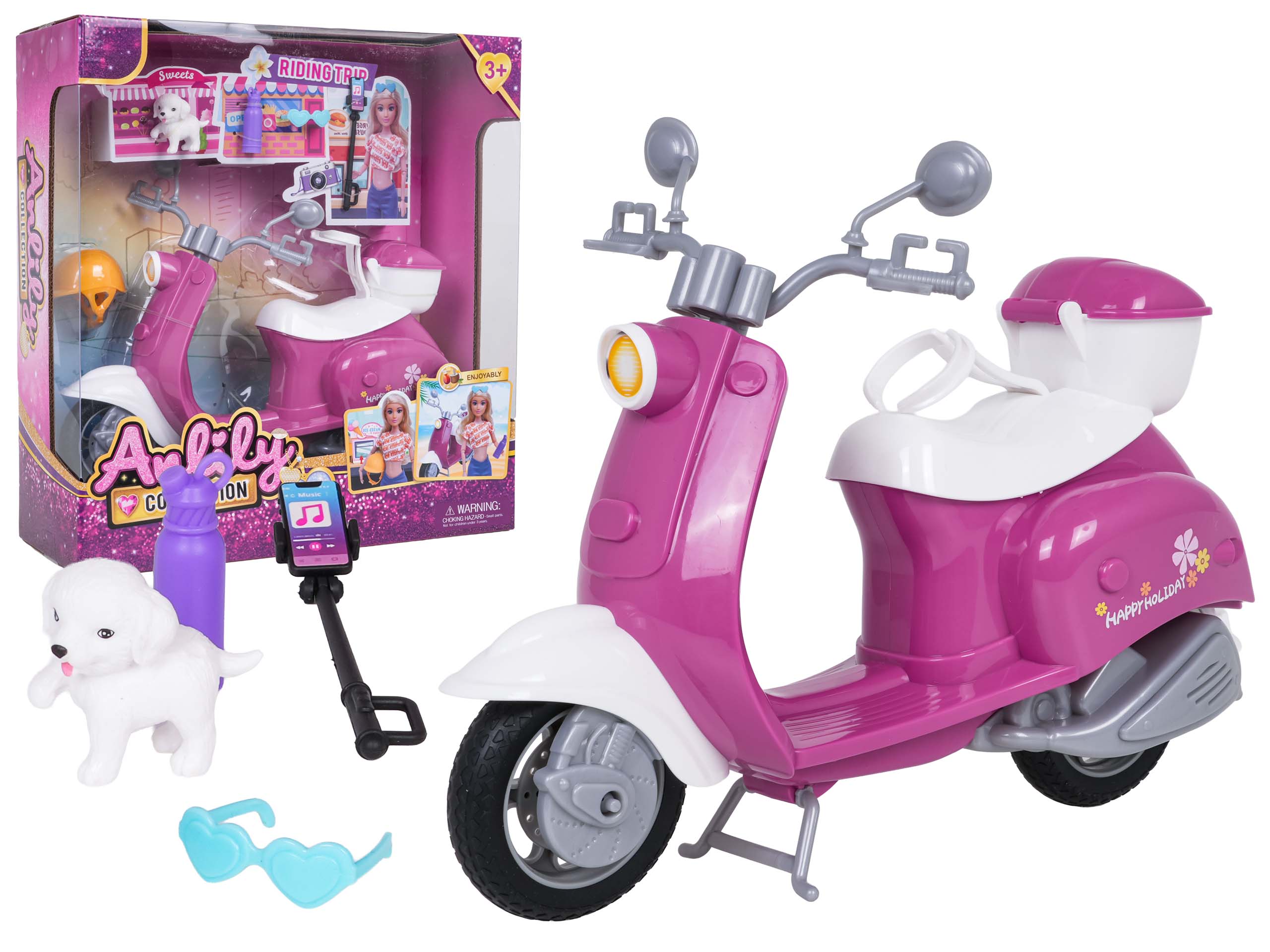 Součástí balení je také množství doplňků: ochranná helma, stylové brýle, lahvička na pití, selfie tyč pro telefon a malý pejsek. Díky nim si děti mohou vymýšlet nekonečné scénáře cest a dobrodružství, což podporuje kreativitu i fantazii.