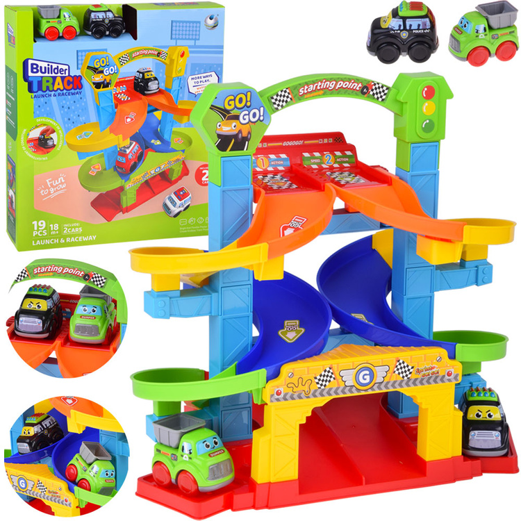Zábavná barevná autodráha pro nejmenší závodníky. Dvě autíčka – policie a sklápěč – sviští po zatočené dráze a poskytují hodiny radostné hry. Vhodná pro děti od 18 měsíců.