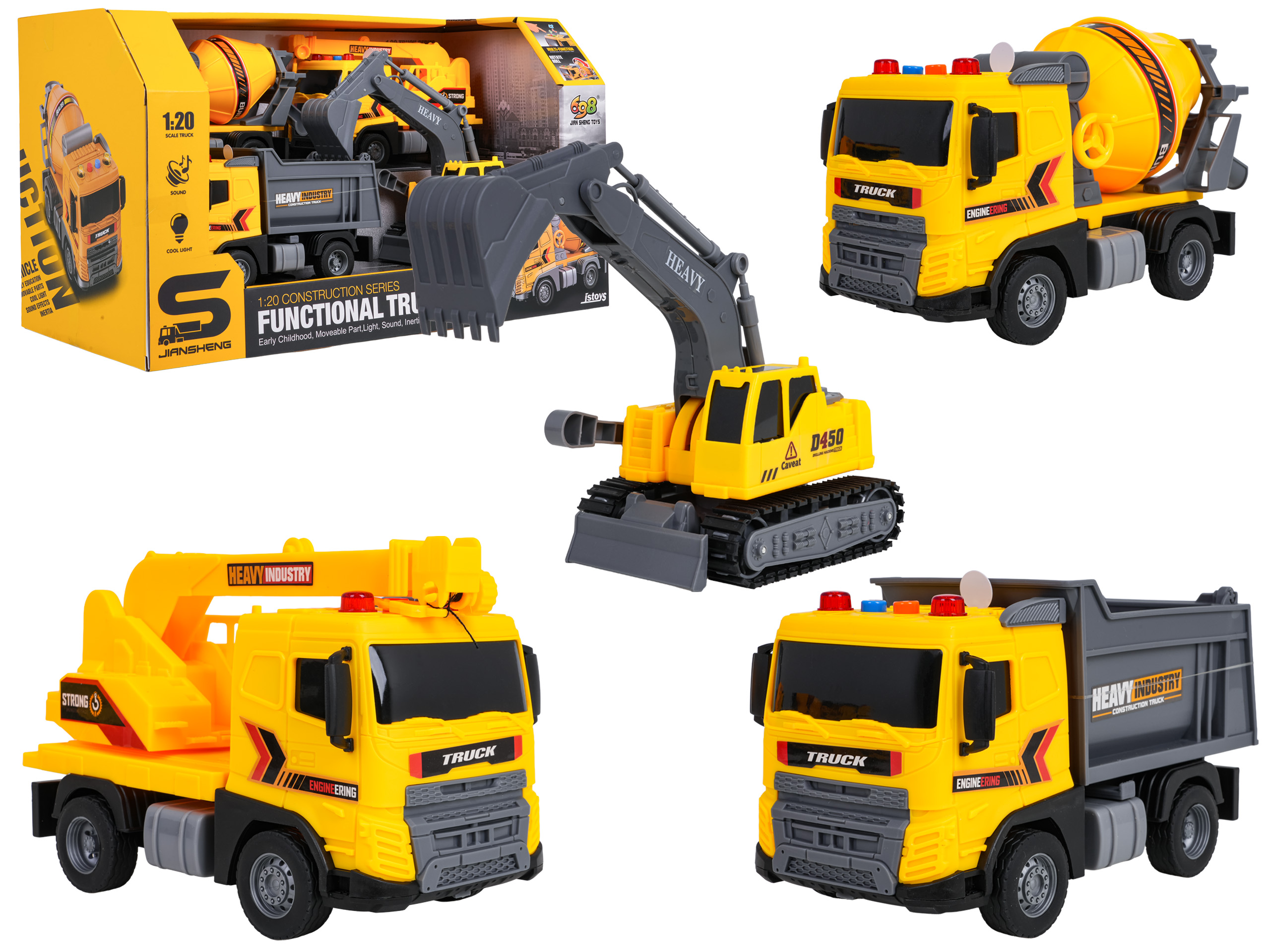 Sada stavebních strojů 1:20 nabízí čtyři detailně zpracované modely – bagr, domíchávač, sklápěčku a jeřáb. Každé vozidlo má funkční prvky, které napodobují skutečné stavební stroje: