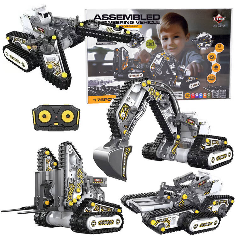 Sestav si vlastní stavební stroje 4v1 z 176 dílků! Postav tank, bagr, vysokozdvižný vozík i lesní stroj a ovládej je pomocí dálkového ovládání. Skvělá kombinace stavebnice a RC auta