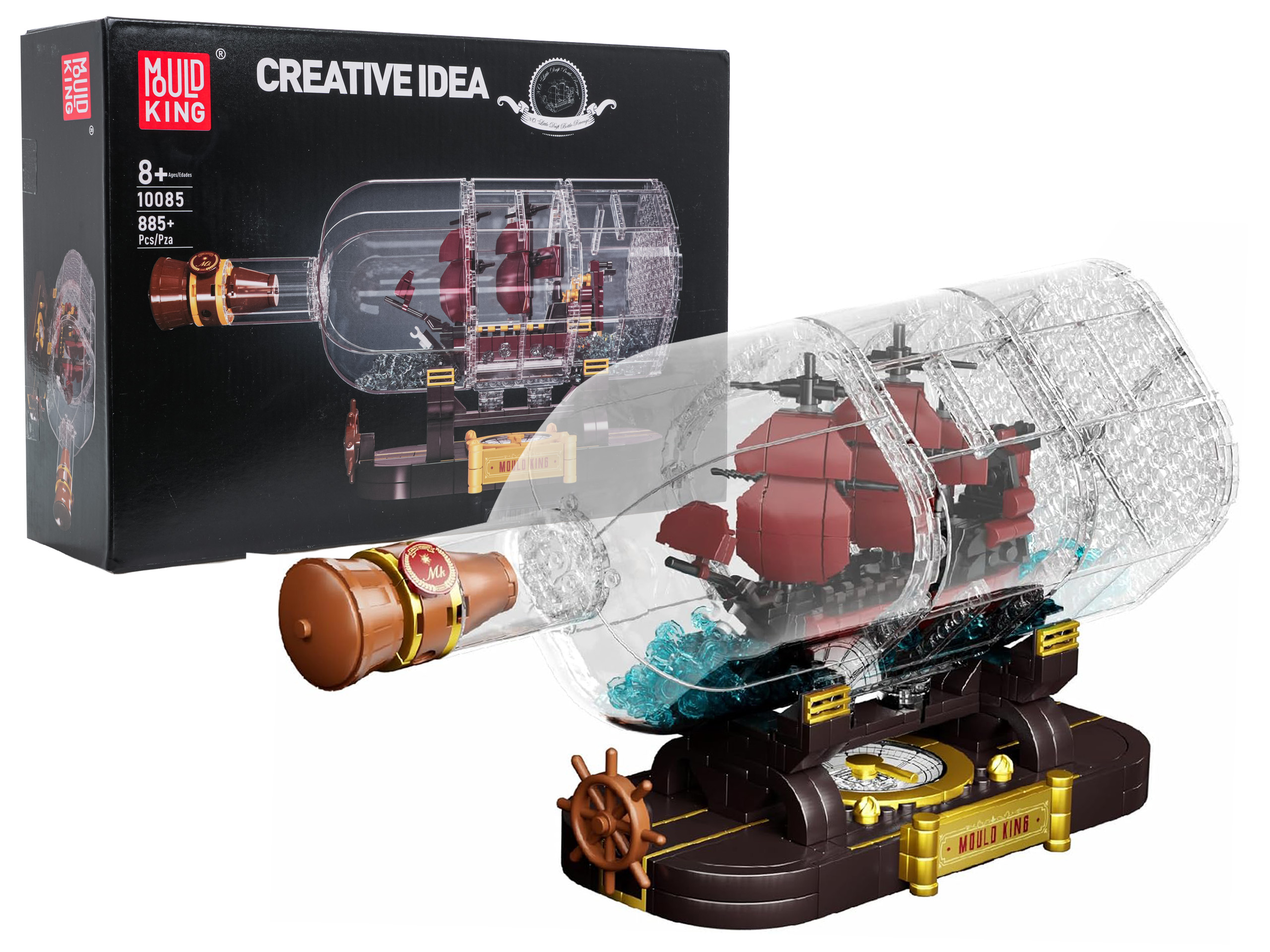 Stavebnice Pirátská loď v láhvi Mould King přináší originální nápad v podobě detailního modelu pirátské lodi uzavřené v průhledné láhvi.
