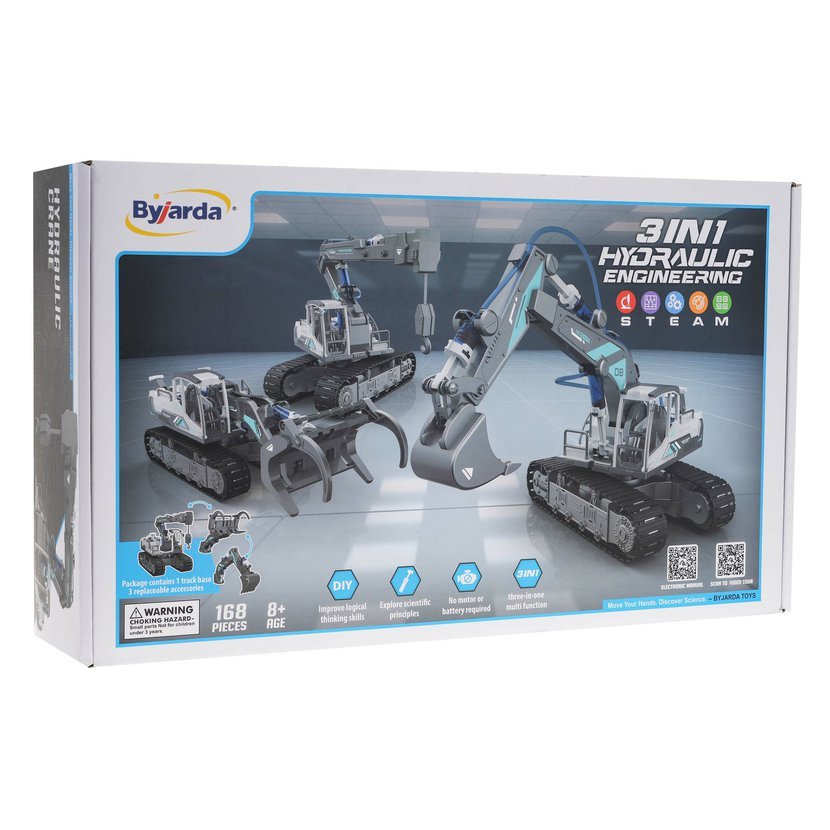 Tento vědecký set obsahuje 168 dílků, ze kterých lze postavit tři realistické modely stavebních strojů: bagr, nakladač dřeva a jeřáb. Každý model má pohyblivé části ovládané hydraulickým systémem na vodu – ramena, lopaty, podavače i otočné platformy. Díky tomu se děti mohou hravou formou seznámit se základy hydrauliky a mechaniky.