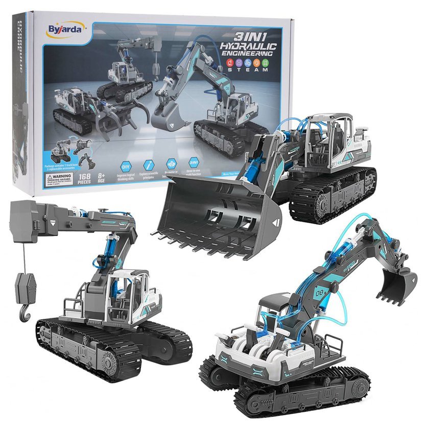 Kreativní stavebnice 3v1 s hydraulickým pohonem umožní postavit funkční modely stavebních strojů – bagru, jeřábu a nakladače na dřevo. 168 dílů, vodní pohon a realistické pohyby.