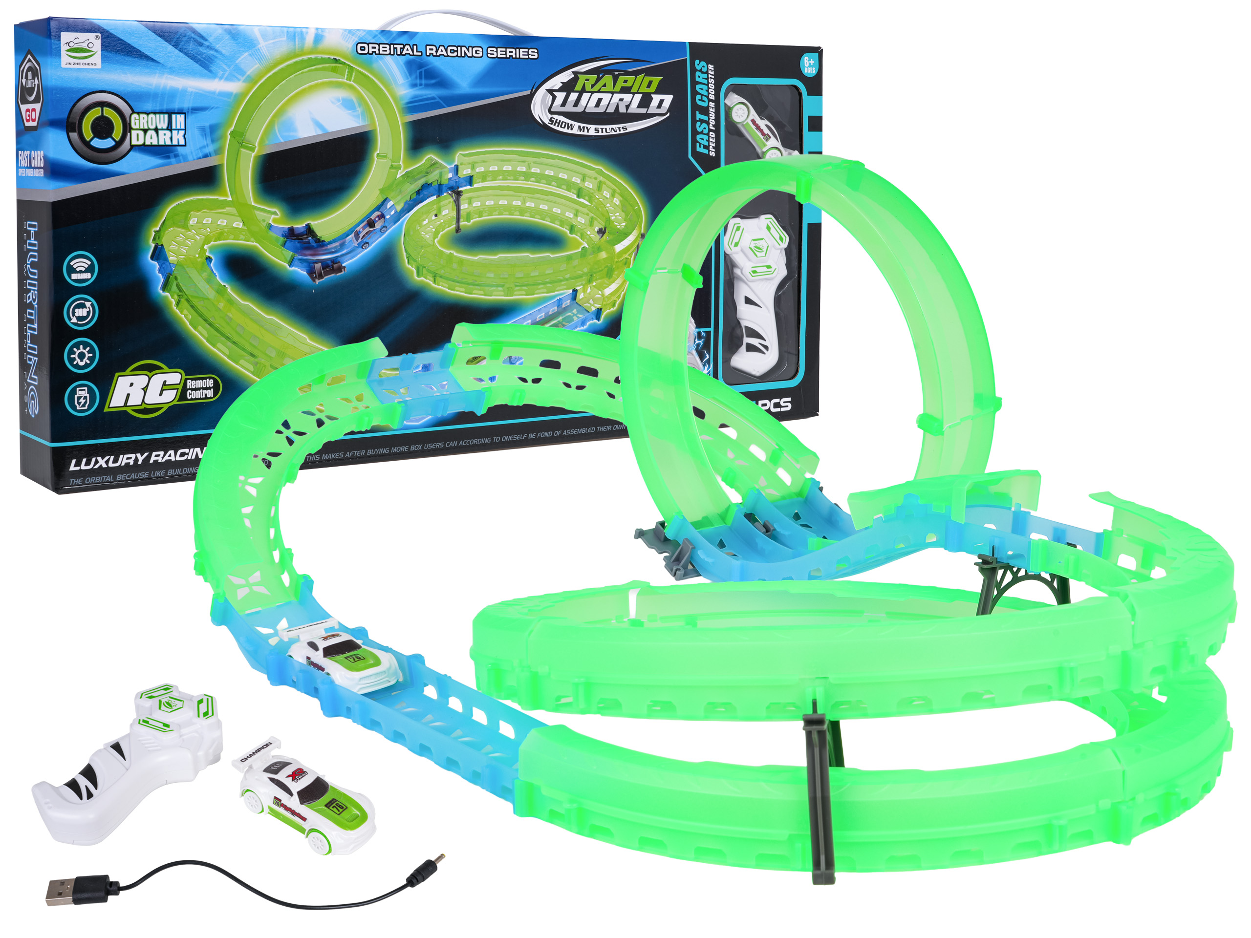 Velká svítící autodráha s LED autíčkem na dálkové ovládání. Fluorescenční závodní dráha, která září ve tmě – ideální hračka pro děti od 6 let, podporující fantazii a zručnost.
