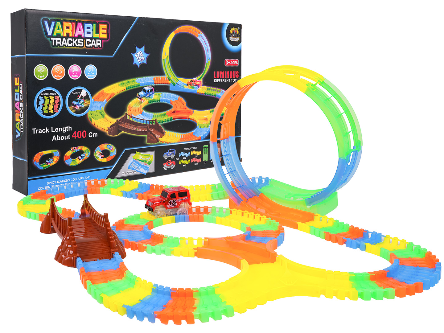 Velká autodráha s 3 smyčkami 360° a autíčkem s LED světlem. Díly jsou fluorescenční – ve tmě svítí, což dělá ze závodů nezapomenutelnou podívanou.
