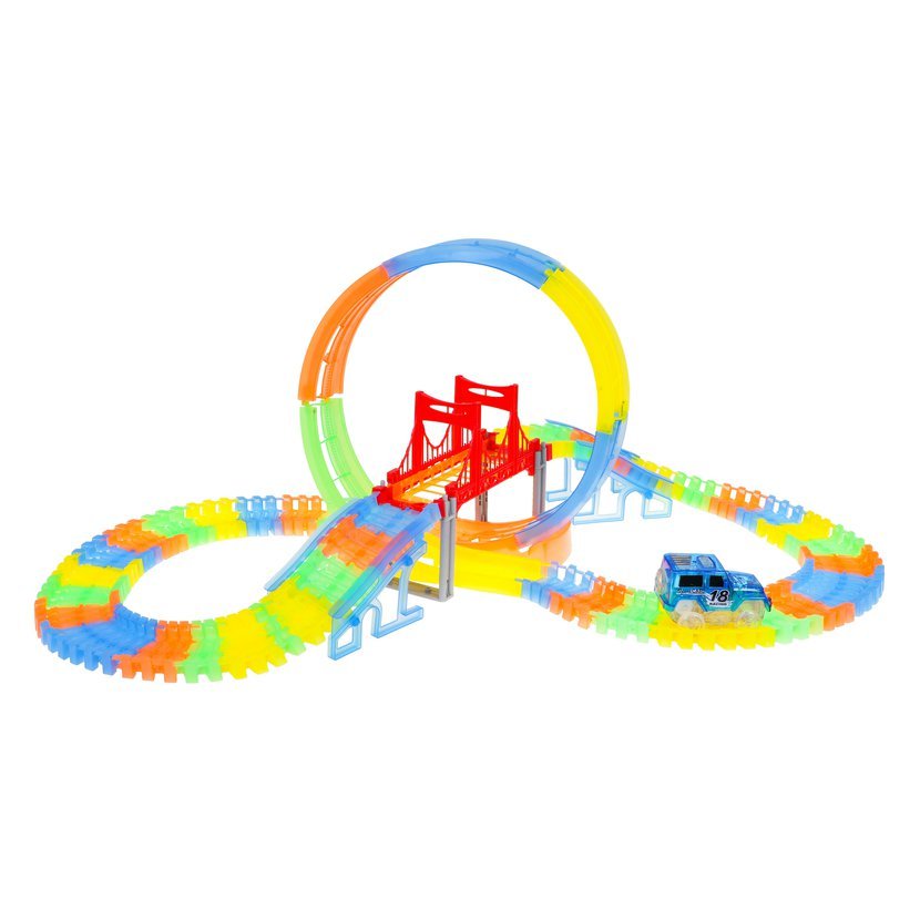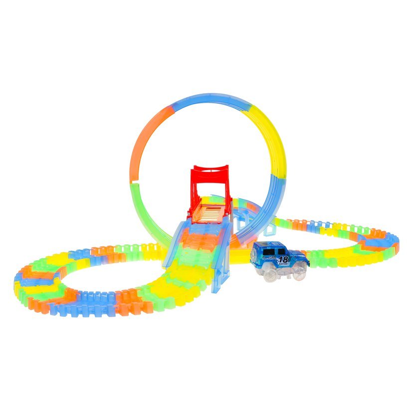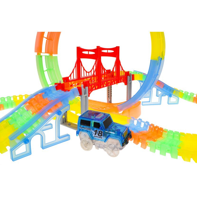 Velká autodráha s 3 smyčkami 360° a autíčkem s LED světlem. Díly jsou fluorescenční – ve tmě svítí, což dělá ze závodů nezapomenutelnou podívanou.