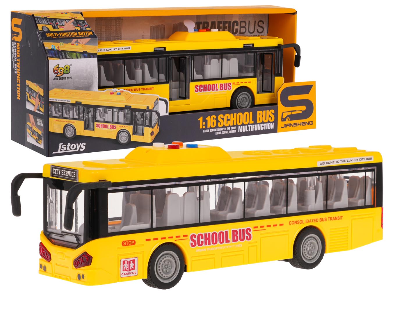 Žlutý autobus se světelnými a zvukovými efekty je vhodný pro děti od 3 let. Model v měřítku 1:16 je detailně zpracovaný a nabízí spoustu realistických funkcí. Dveře lze otevřít pomocí otočného kolečka nad nimi. Na střeše se nachází tlačítka, která spouštějí zvuky – klakson, otevírání dveří, start motoru nebo couvání. Každý zvuk doprovází rozsvícení barevných světel uvnitř autobusu. Při jízdě se uplatní gumová kola se zpětným (pull-back) pohonem, díky nimž se autobus hladce pohybuje po podlaze. Hračka je napájena bateriemi typu 3 × AG13 (součástí balení).